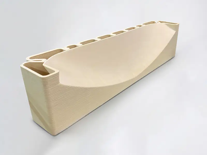 Die hybride Fertigung revolutioniert die Herstellung präziser Laminierformen für CFK- und GFK-Komponenten. Durch großformatigen 3D-Druck (Schichthöhe 3 mm, Bahnbreite 14 mm) und effiziente CNC-Nachbearbeitung entstehen individuelle Formen schnell und kostengünstig.